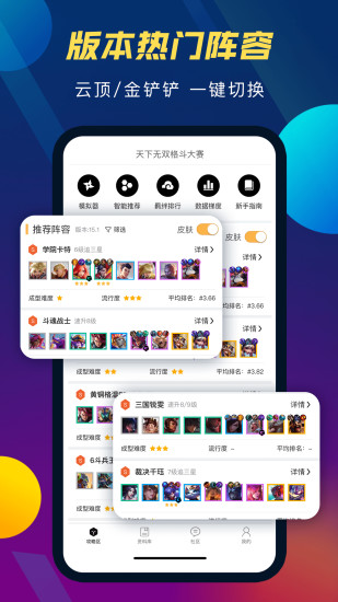 TFT云頂攻略助手!用手機可輕松查詢當前熱門陣容攻略,裝備羈絆數據,外服手游戰績等,還有陣容智能推薦,助你輕松上分,玩轉云頂! 新增重磅功能:手游玩家的專屬神器,游戲懸浮窗!邊玩邊查攻略,毫無鴨梨! PS:金鏟鏟之戰攻略正在同步更新中~ 【核心功能】 · 當前熱門陣容:陣容評級,陣容站位,陣容過渡,詳細攻略輕松掌握 · 陣容智能推薦:根據你場上的英雄和裝備,智能為你匹配合適的陣容 · 游戲數據查詢:英雄/裝備/強化符文數據、評級,羈絆排行等各種查詢一應俱全 · 模擬陣容站位:模擬排兵布陣,組成羈絆,創建屬于自己的陣容 · 游戲資訊攻略:網羅各路大神講解攻略 or 視頻,還有游戲資訊 · 外服手游戰績:實時查看外服手游戰績,輕松掌握對局信息 · 手游世界排行:輕松查詢世界前100名的大神數據,學習陣容助力上分。