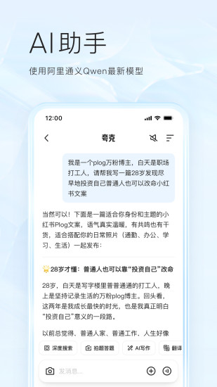 夸克是你的AI全能助手,由阿里巴巴自主研發,使用通義Qwen最新閉源模型。 【AI 超級框】 一句話即可搜索、問答,連接網頁、文檔與知識的超級入口。 支持圖文、表格、視頻等多形態展示。 【助手模式】 全新助手模式,讓夸克變成你可對話的智能伙伴。 它能記住上下文、理解語氣和意圖,幫你寫報告、規劃日程、生成靈感。 【AI生產力工具】 AI寫作:寫方案、報告、文案,一句話生成,邏輯流暢自然。 夸克老師:智能答題、知識總結,學習效率倍增。 夸克PPT:輸入主題即可生成專業演示文檔,自動排版與結構優化。 夸克翻譯:多語言即時互譯與語義理解。 夸克掃描王:拍照識別文字與表格,自動提取、整理、總結。 【夸克網盤】 6T超大空間,照片、文件安心存儲;高清畫質+AI字幕,刷劇更過癮。 【夸克小說】 海量熱門小說無限暢讀。 如果你在使用產品過程中遇到了任何問題或需要我們協助,請通過以下方式聯系我們。 反饋方式: -軟件反饋:設置->意見反饋 -郵件反饋:kksupport@service.alibaba.com -官方網站:http://www.quark.cn
