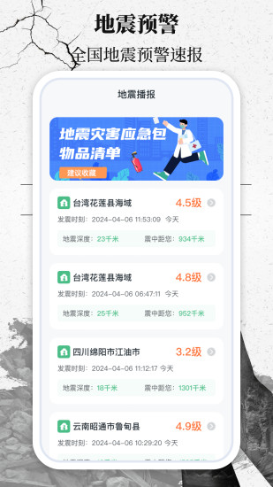 一個集地震、應急工具箱、火災、水災及海洋災害預警于一體的智能應用程序。它利用先進的數(shù)據(jù)分析技術(shù),為用戶提供及時、準確、全面的災害預警信息,致力于守護每一個生命,防患于未然。 地震消息播報:實時監(jiān)測全國地震活動,一旦有地震發(fā)生,立即通知用戶,并提供地震詳情、震級、震源深度等詳細信息。 應急工具箱:包含sos手電筒、求救鈴聲、指南針、應急避難所等多種應急工具 其他災害預警:通過各類種安全科普,實現(xiàn)火災和水災等一些列災害的預警及對應的處理方法,讓安全隱患消失在萌芽之中。 海洋災害預警: 監(jiān)測海浪、潮汐和臺風等海洋災害,為用戶提供準確的預警信息,幫助沿海地區(qū)居民提前做好防范措施 防患未然,共創(chuàng)美好未來。